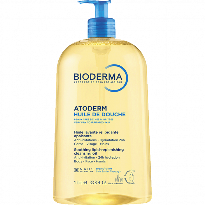 Atoderm Huile de douche làm dịu và bảo vệ da khỏi các tác động bên ngoài nhờ công thức độc quyền bao gồm biolipid thực vật, vitamin PP và bằng sáng chế Skin Barrier Therapy.